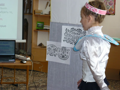 3. Наталья Дигор не только талантливый художник. Она руководит народным ансамблем «Кэку», сама придумывает танцевальные композиции. Одну из них девочки сейчас покажут. А пока они готовятся задание для мальчиков: присмотритесь к костюмам, к движениям танца и подберите определения к ним.